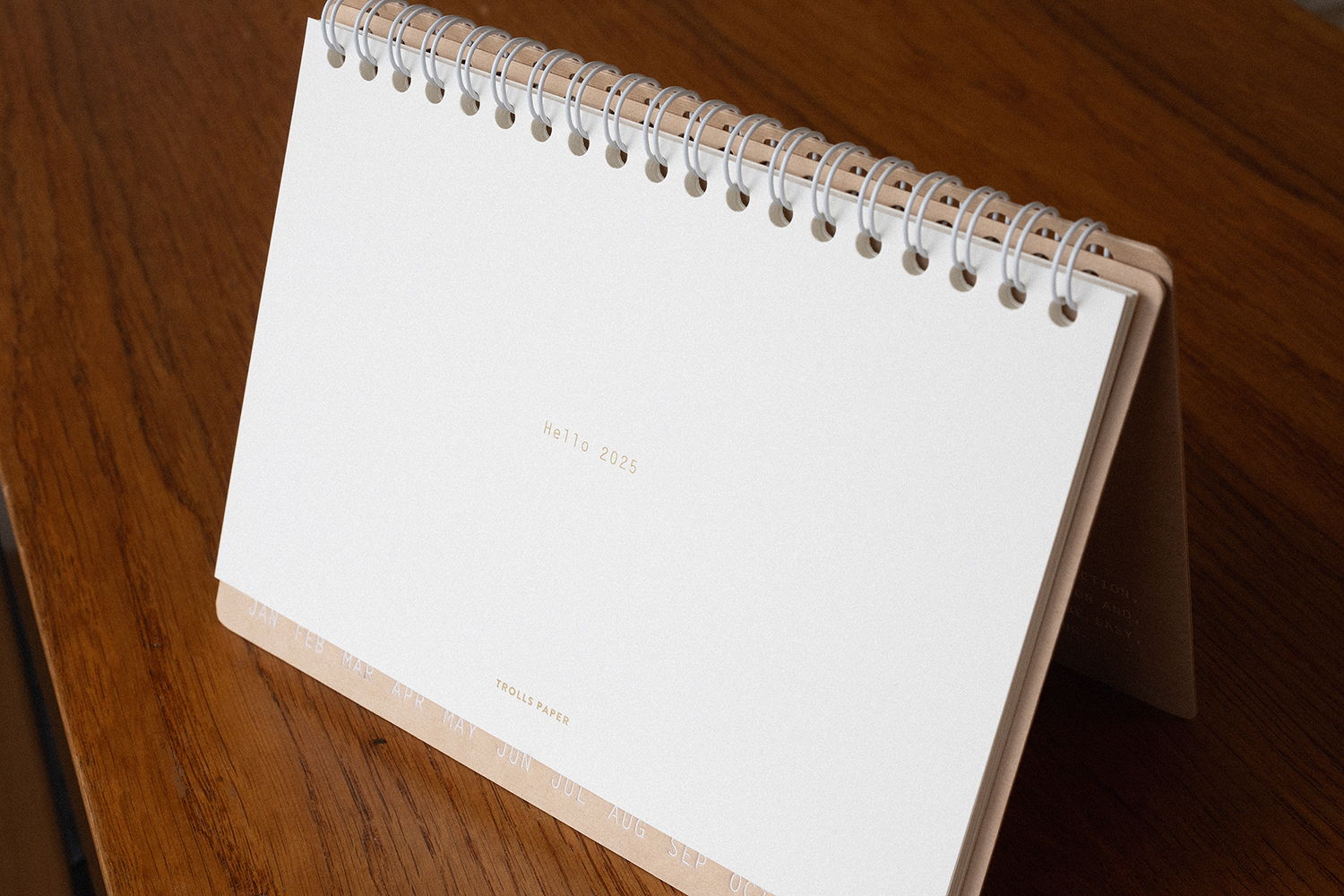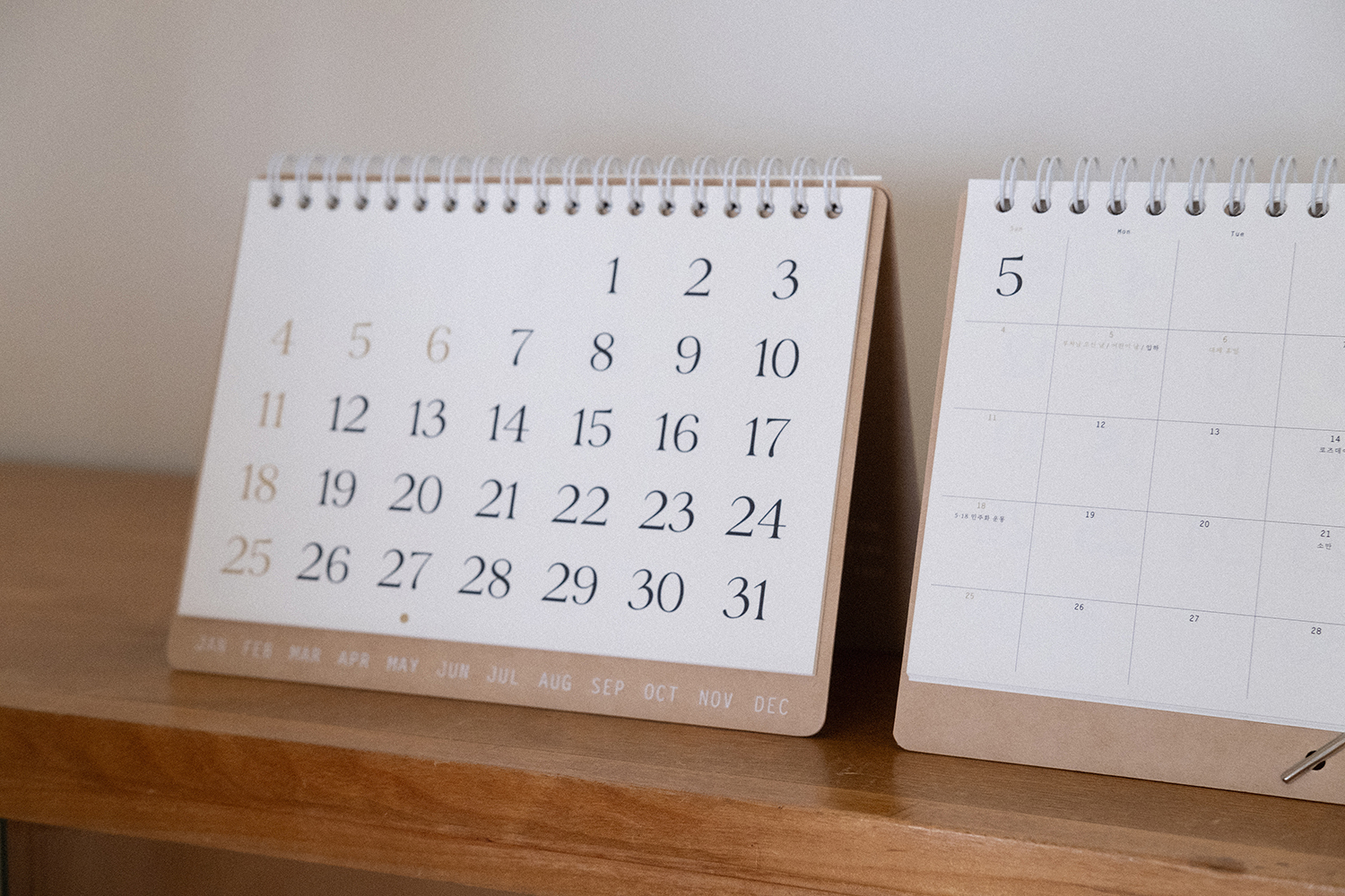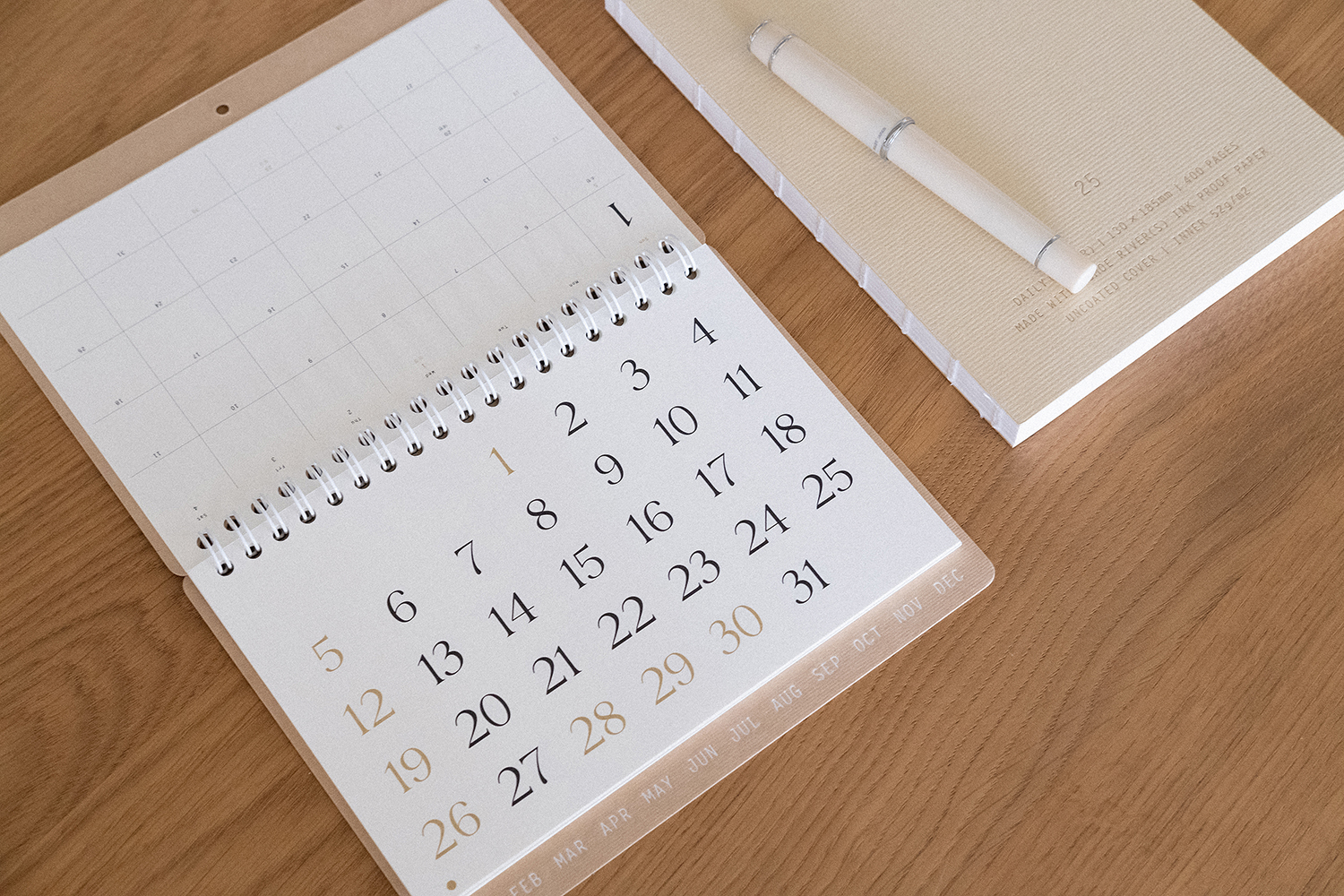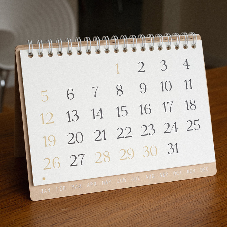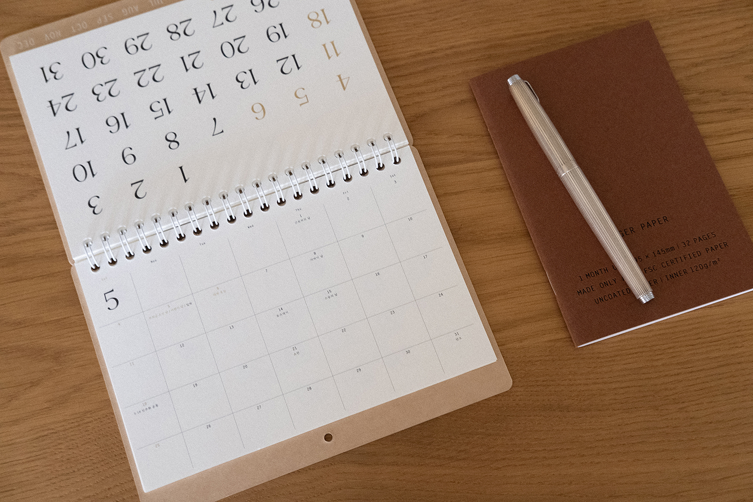 플랫한 형태로 기록할 수 있어 편리합니다. 2025 캘린더의 표지는 표백되지 않은 자연스러운 브라운 색감의 내추럴 보드입니다.