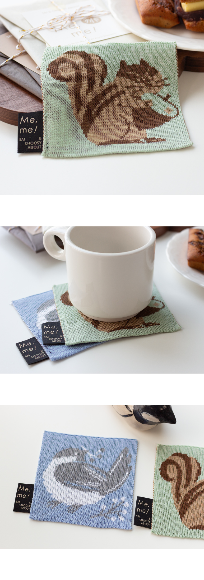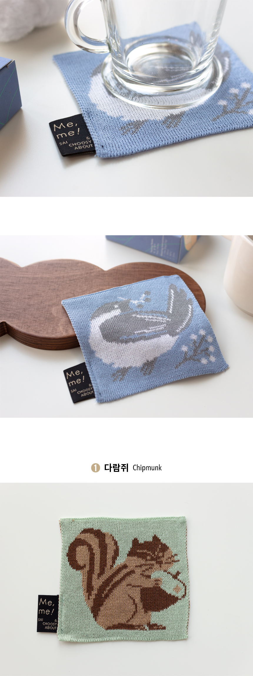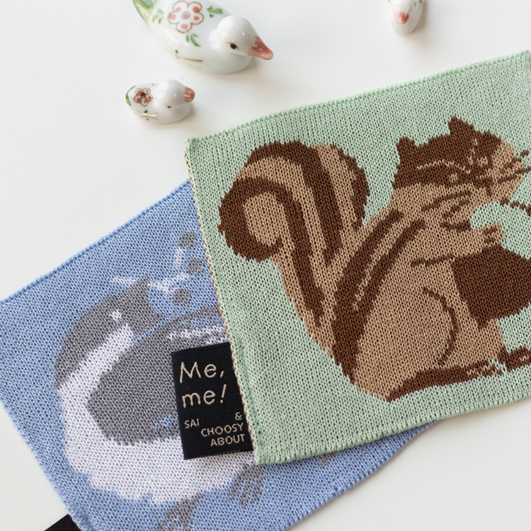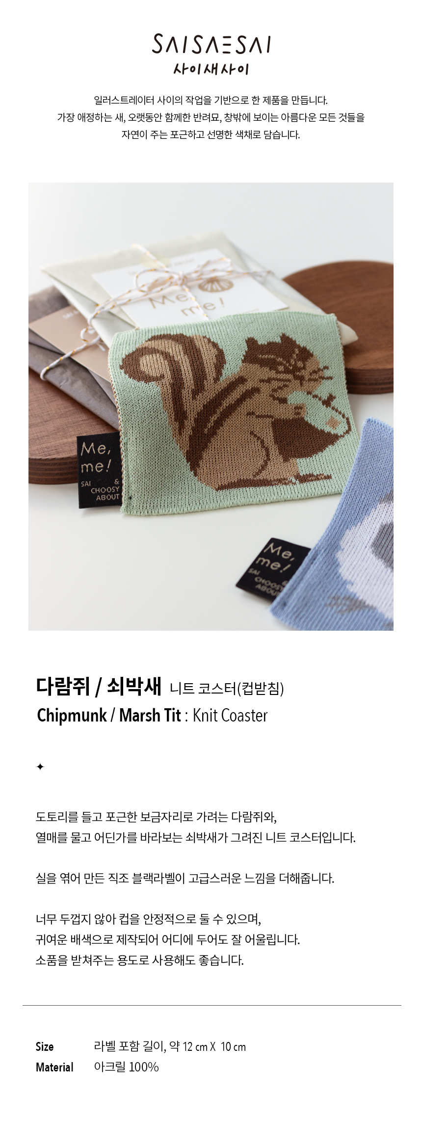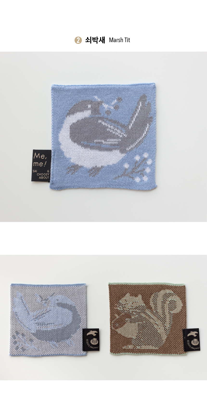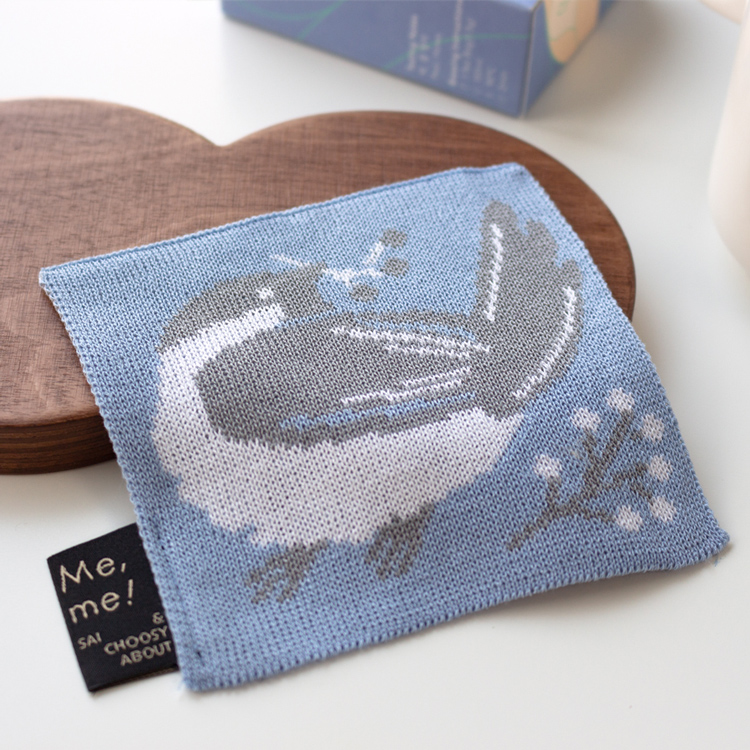 열매를 물고 어딘가를 바라보는 쇠박새가 그려진 니트 코스터입니다.