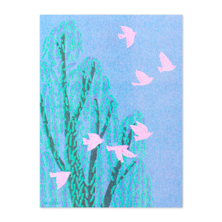 차분히 가라앉은 푸른 하늘, 새벽빛에 빛나는 버드나무,