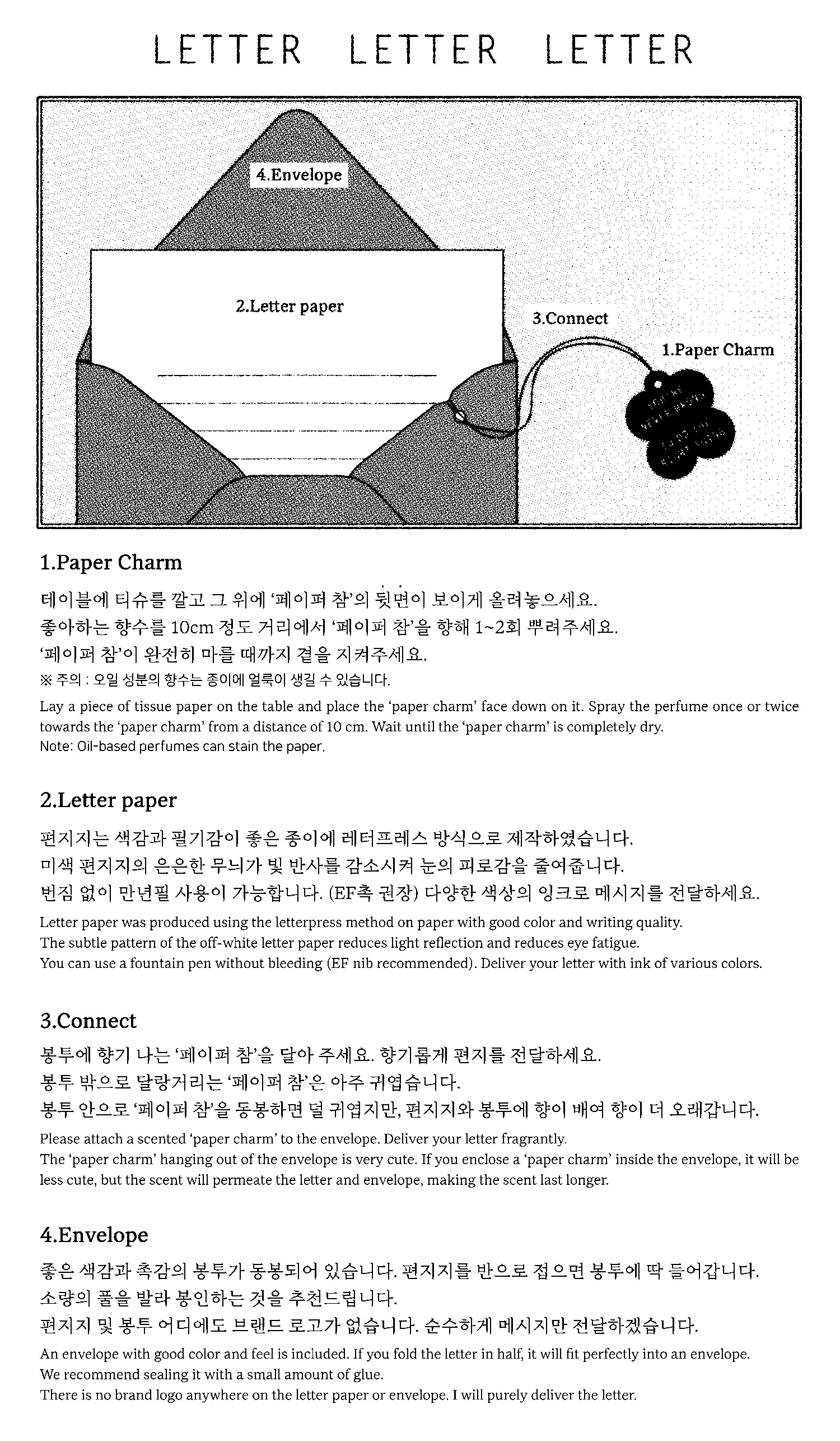 편지지와 봉투에는 코튼 펄프가 함유되어 있어 시간이 지나면, ‘페이퍼 챰’의 향이 전체에 배이게 됩니다.