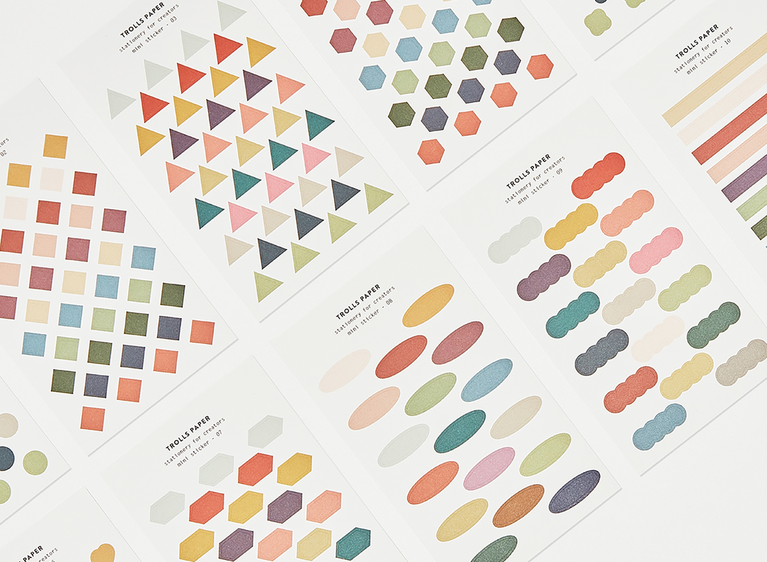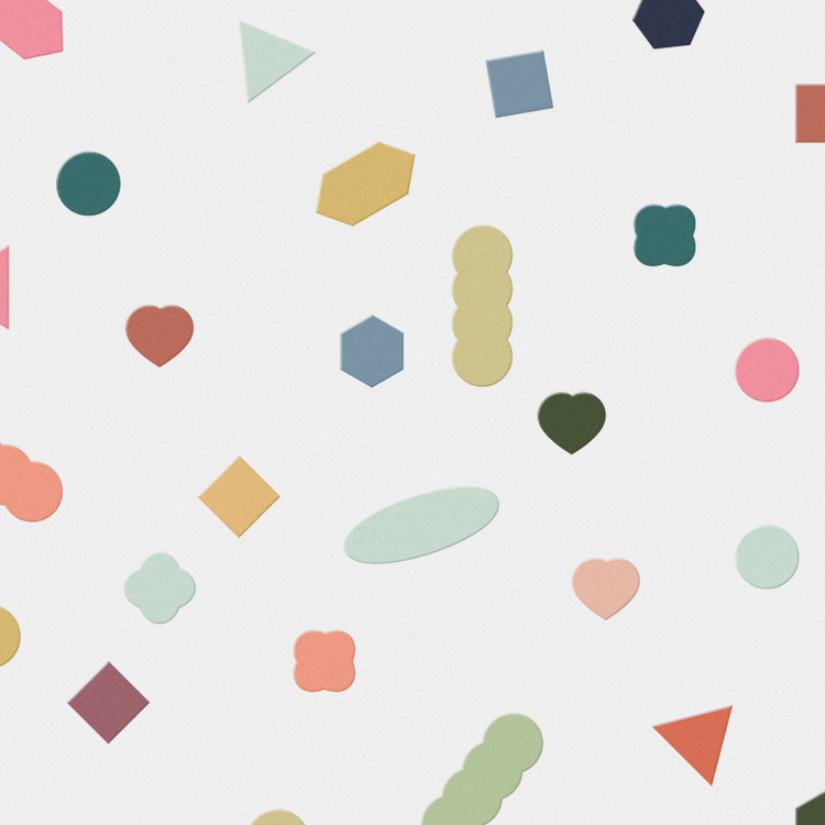 각 장마다 원, 세모, 타원, 구름등의 모양으로 다양한 도형과 컬러로 이루어져 다양한 용도로 활용 가능한 스티커입니다.